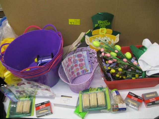 BOX OF MISC. ARTIFICIAL FLOWERS, BASKETS, TOOTHPICKS, BAGS, ETC.