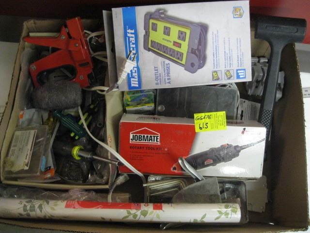 BOX OF MISC. ELECTRICAL BREAKERS, JOBMATE ROTARY TOOL, POWER BAR, ASST. TOOLS, ETC.