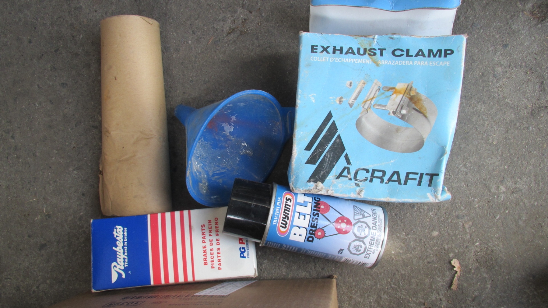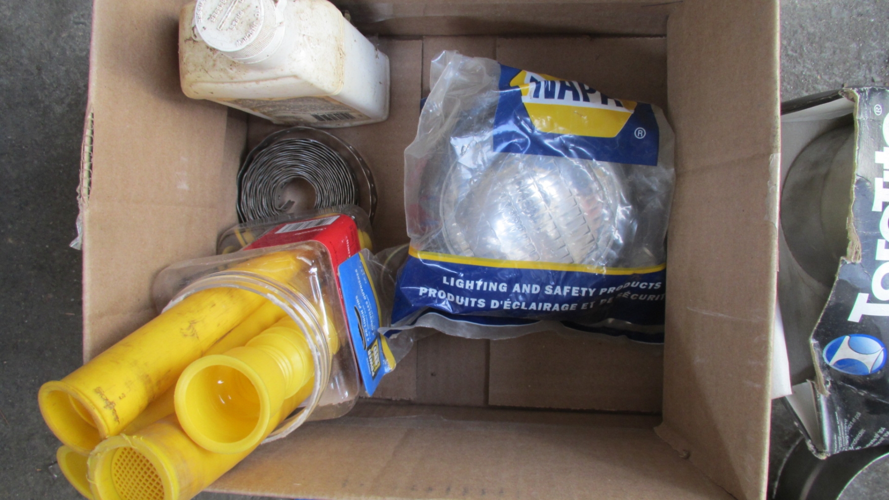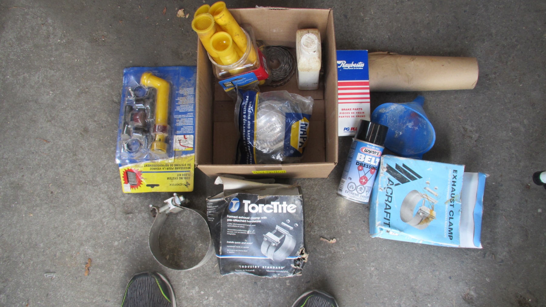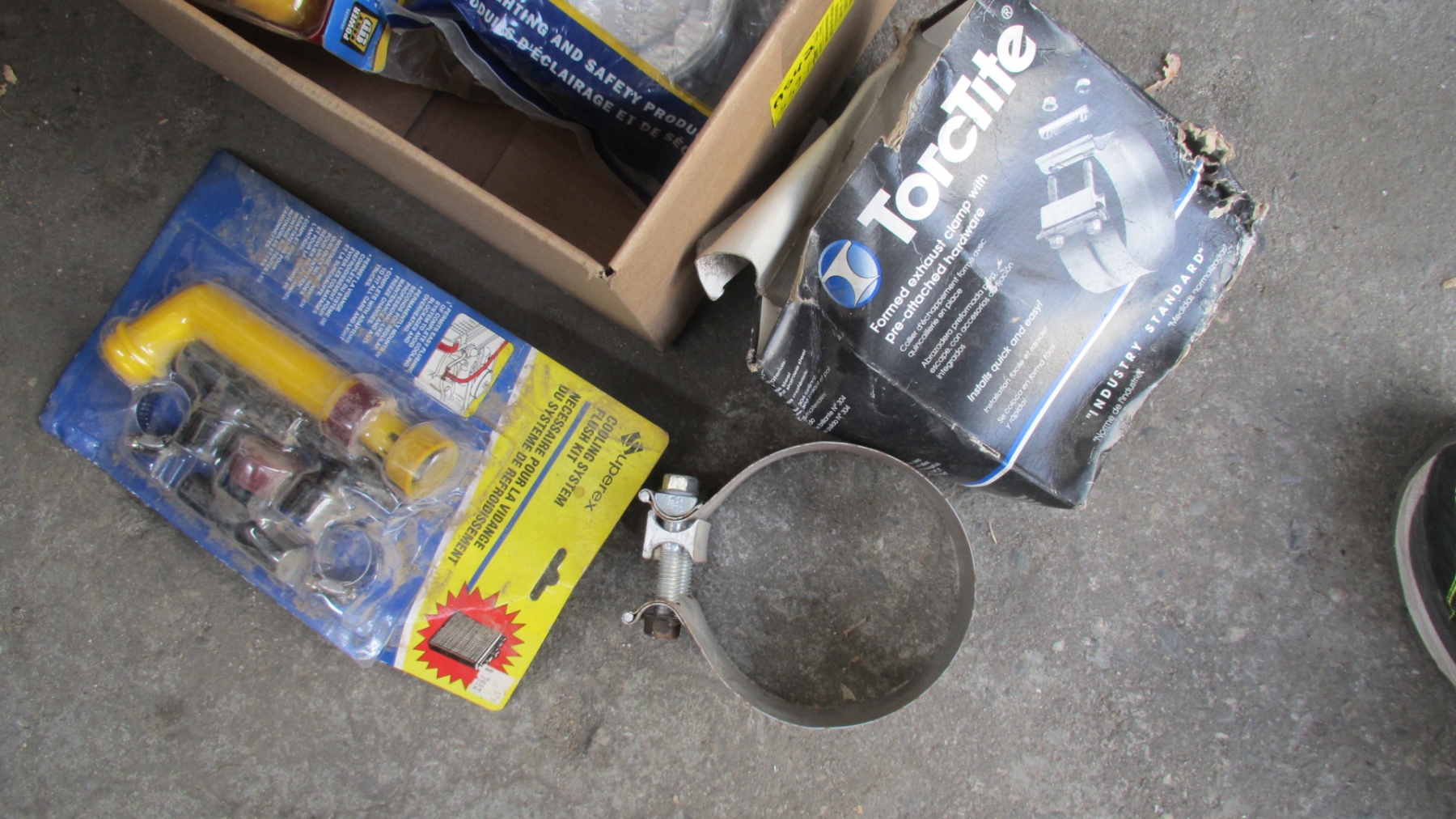BOX OF MISC. EXHAUST CLAMPS, NAPA LIGHT, FUEL TANK FITTINGS, COOLING FLUSH, ETC.