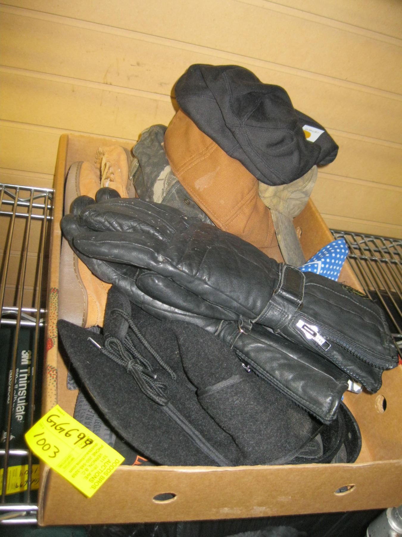 BOX OF MISC. GLOVES, HATS, BELT, ETC.