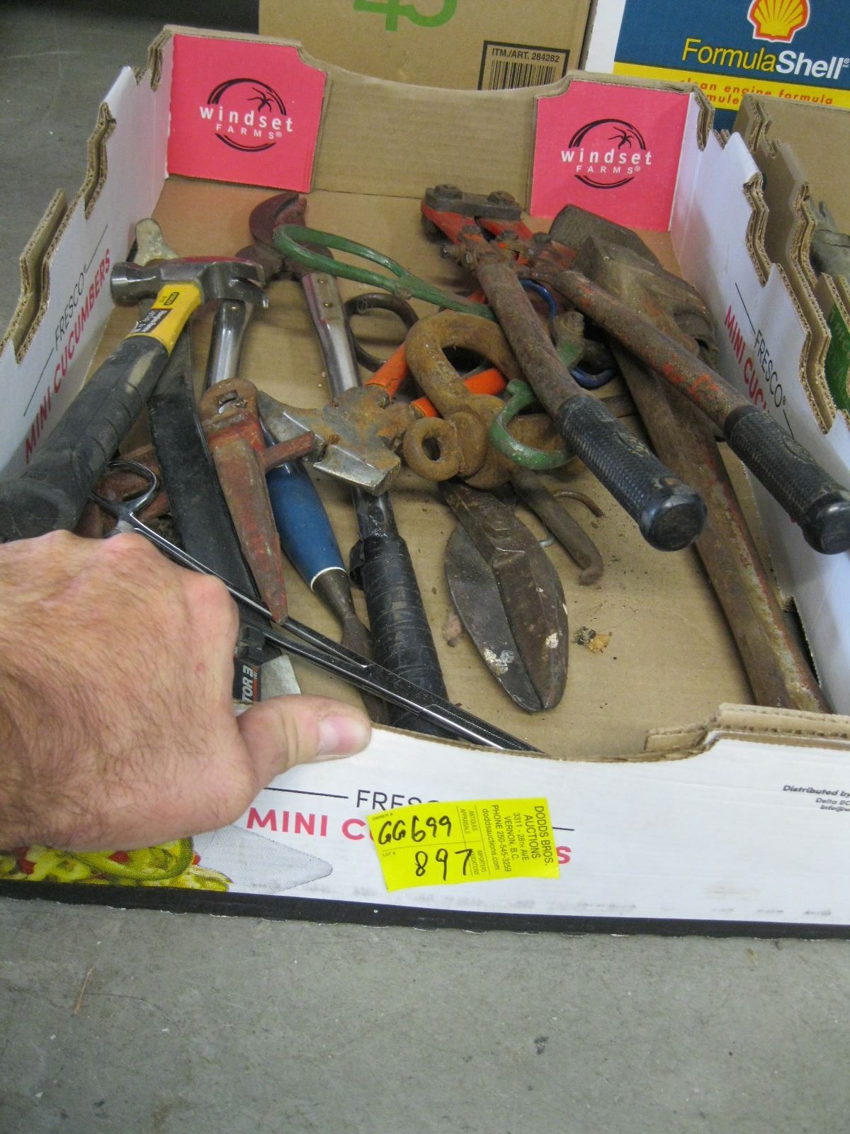 BOX OF MISC. HAMMERS, PIPE WRENCH, BRAKE CONTROLLER, ETC.