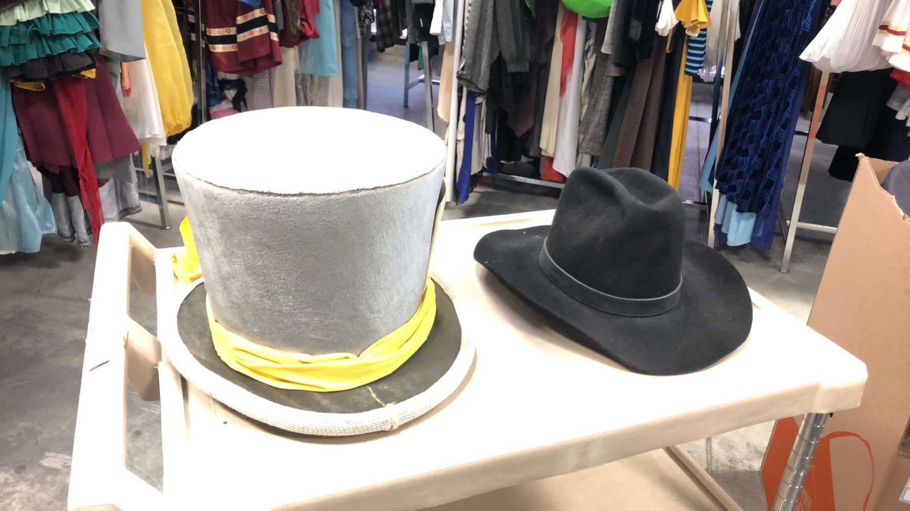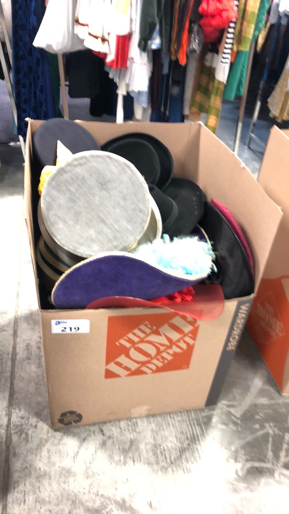 BOX OF MISC HATS INCLUDING MAD HATTER, COWBOY, MUSKETEER & MORE