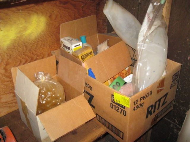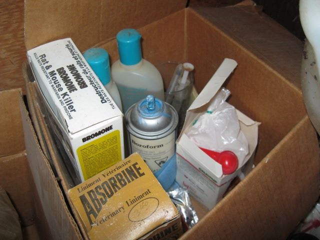 BOX OF MISC. LINAMENT, ANIMAL SYRINGES, ETC.