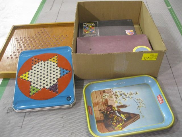 BOX OF MISC. METAL GAME BOARDS, COKE TRAY, SCRABBLE GAME, ETC.