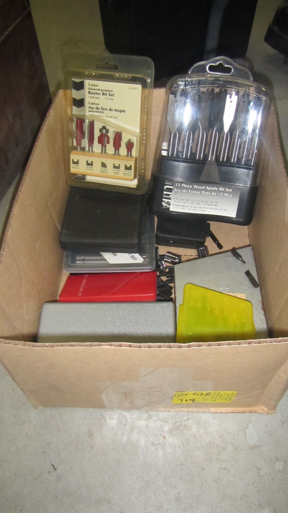 BOX OF MISC. ROUTER BITS, DRILLBITS, ETC.
