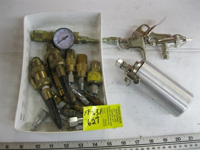 BOX OF MISC SMALL PAINT SPRAYER, AIR FITTINGS ETC.