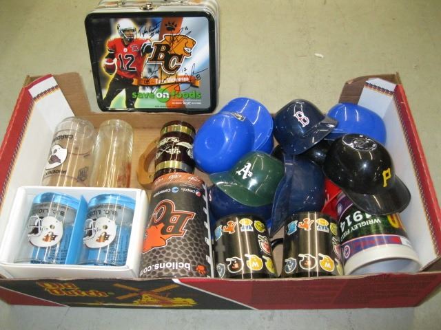 BOX OF MISC. SPORTS COLLECTABLES, LUNCH KIT, GLASSES, PLASTIC CAPS, ETC.