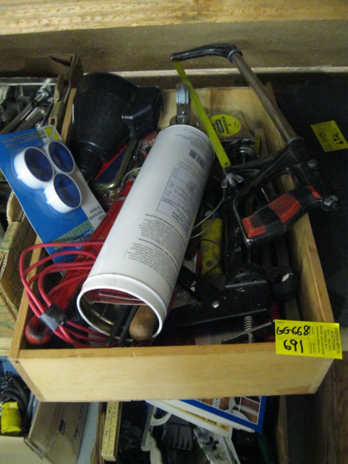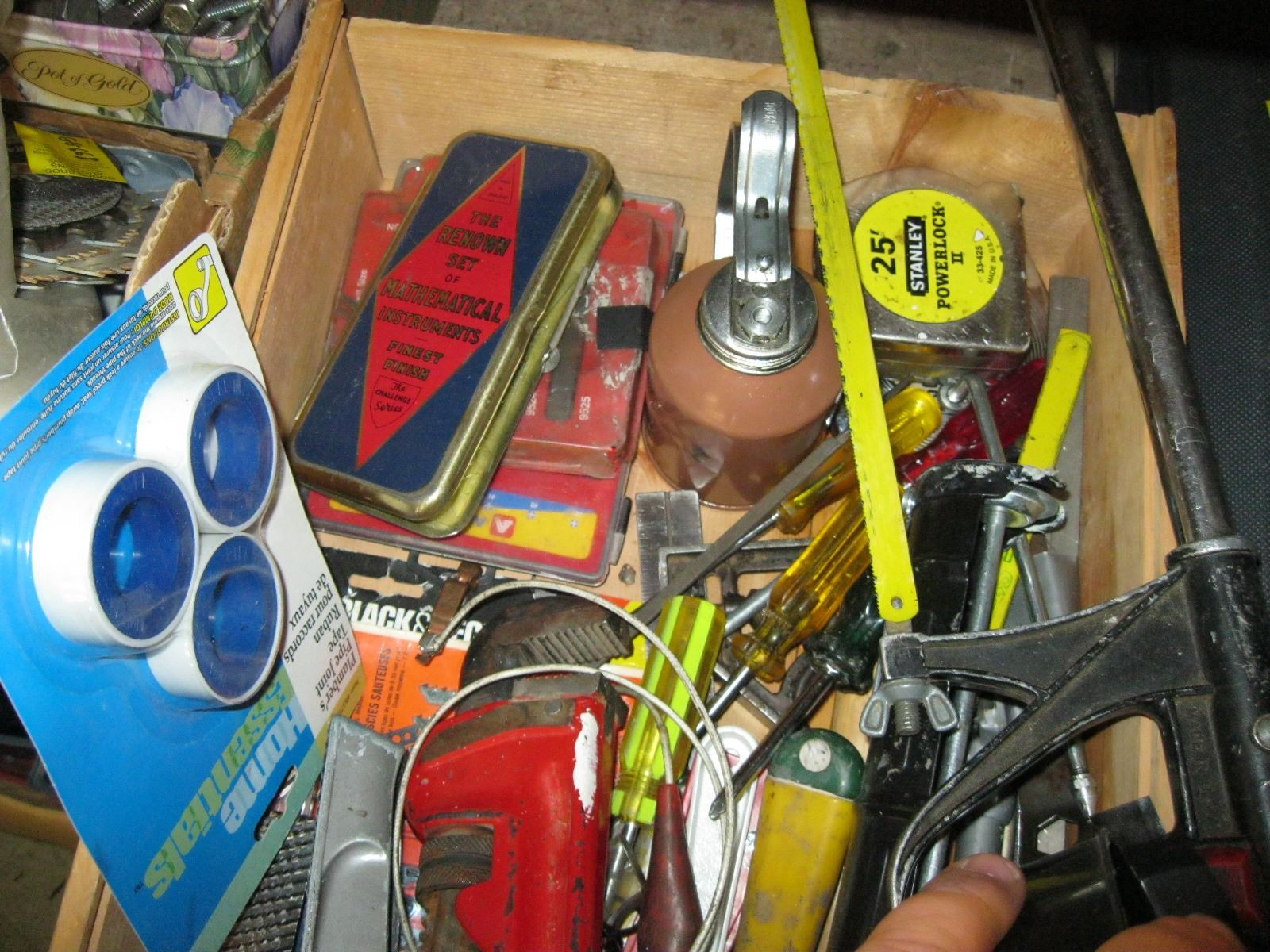 BOX OF MISC. TOOLS, PIPEWRENCH, HACKSAW, FILES, ETC.