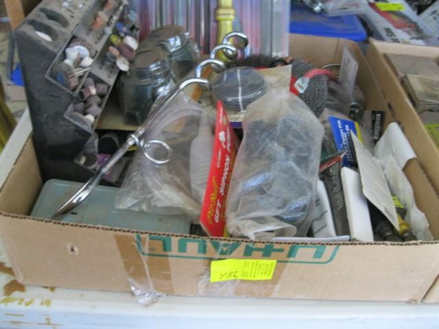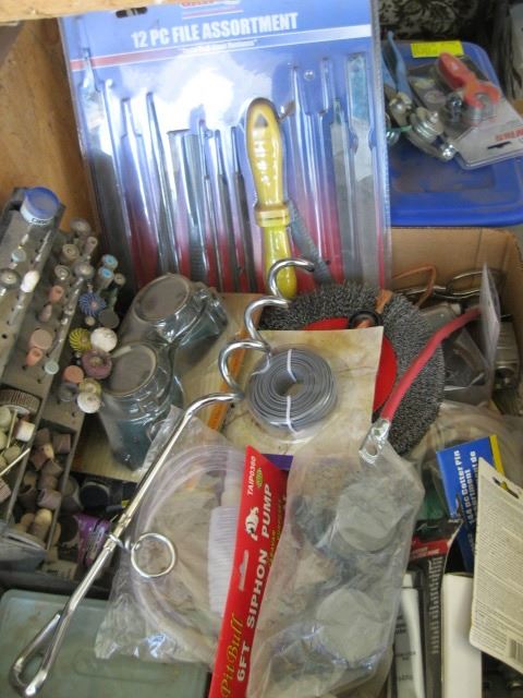 BOX OF MISC. - WELDING GOGGLES, TILES, DRILL BITS, ETC.