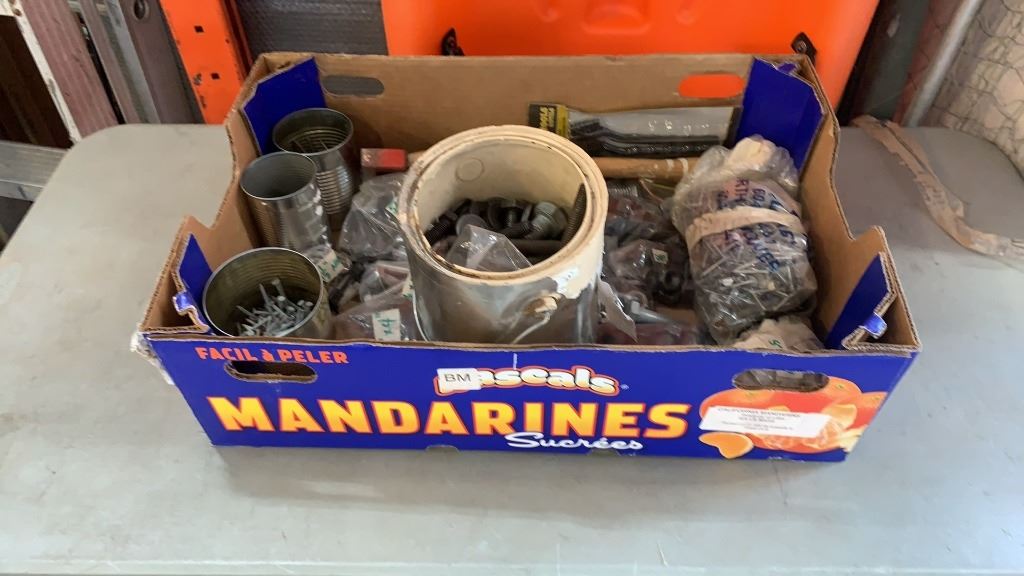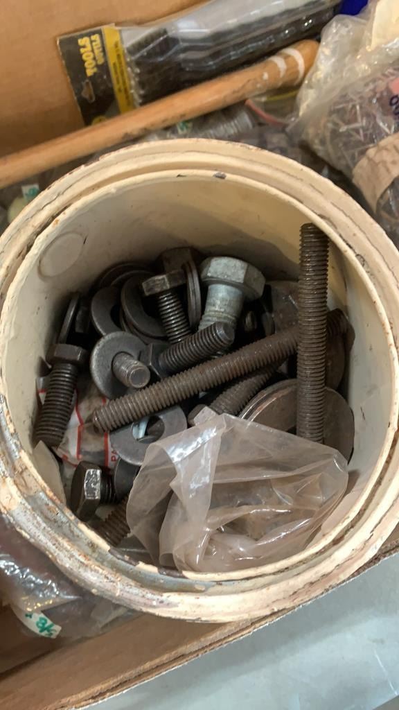 BOX OF MOSTLY 5/8" NUTS AND BOLTS WITH HATCHET AND NAILS