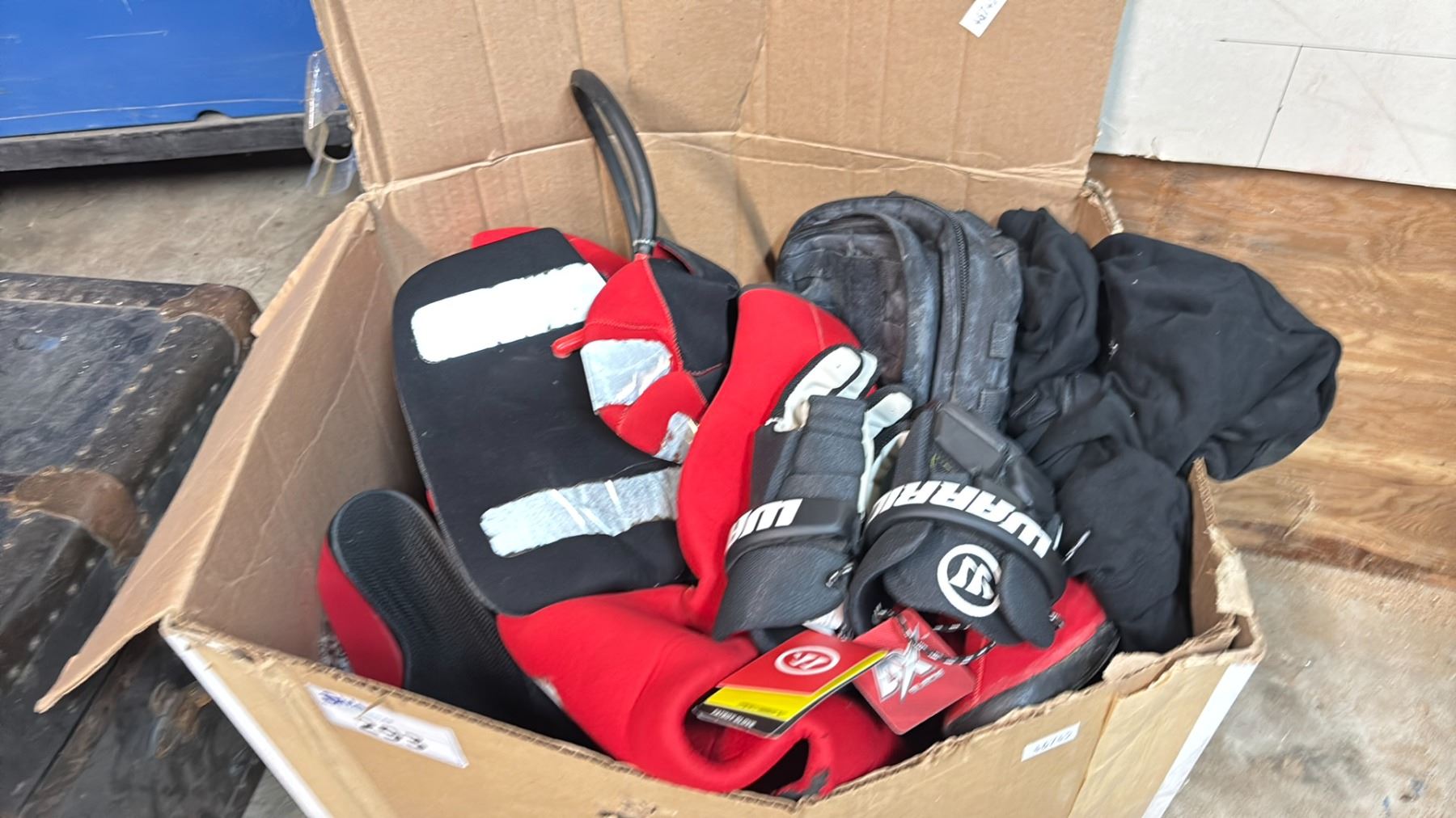 BOX OF MOVIE SET WET SUIT, WARRIOR LACROSSE GLOVES, ASSORTED TACTICAL BAGS & MORE