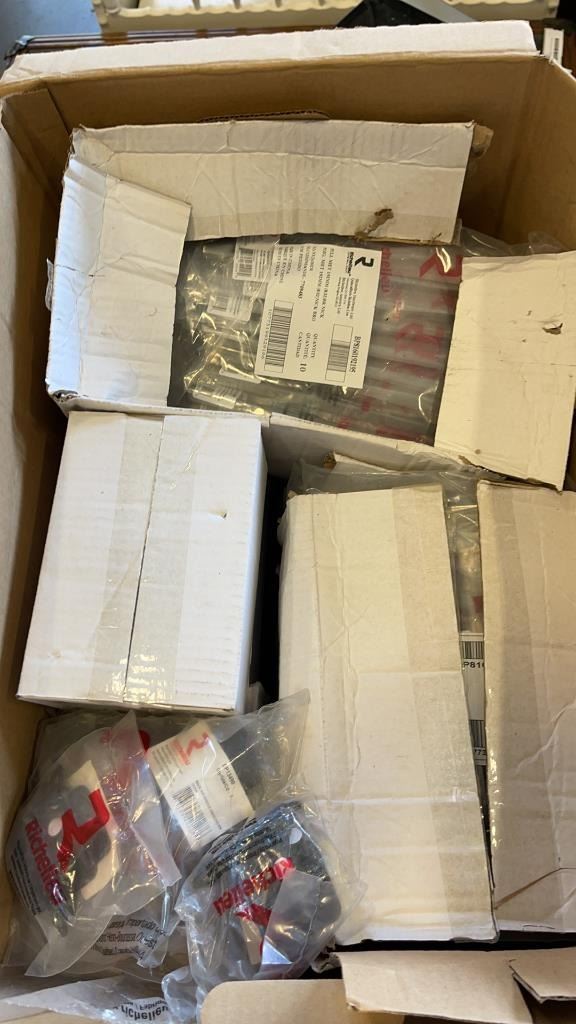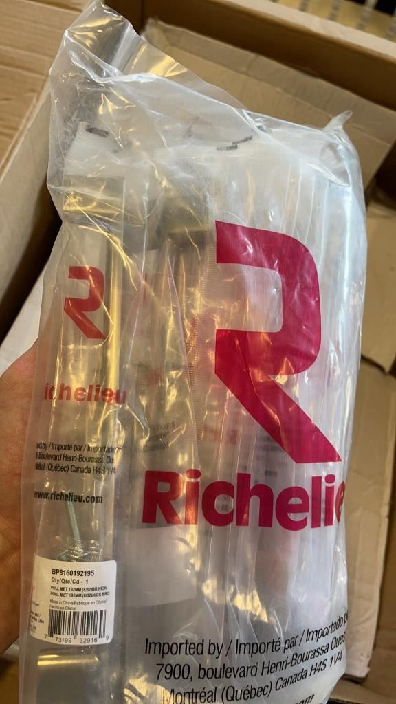 BOX OF NEW CABINET HANDLES, HINGES SIGNS AND MORE
