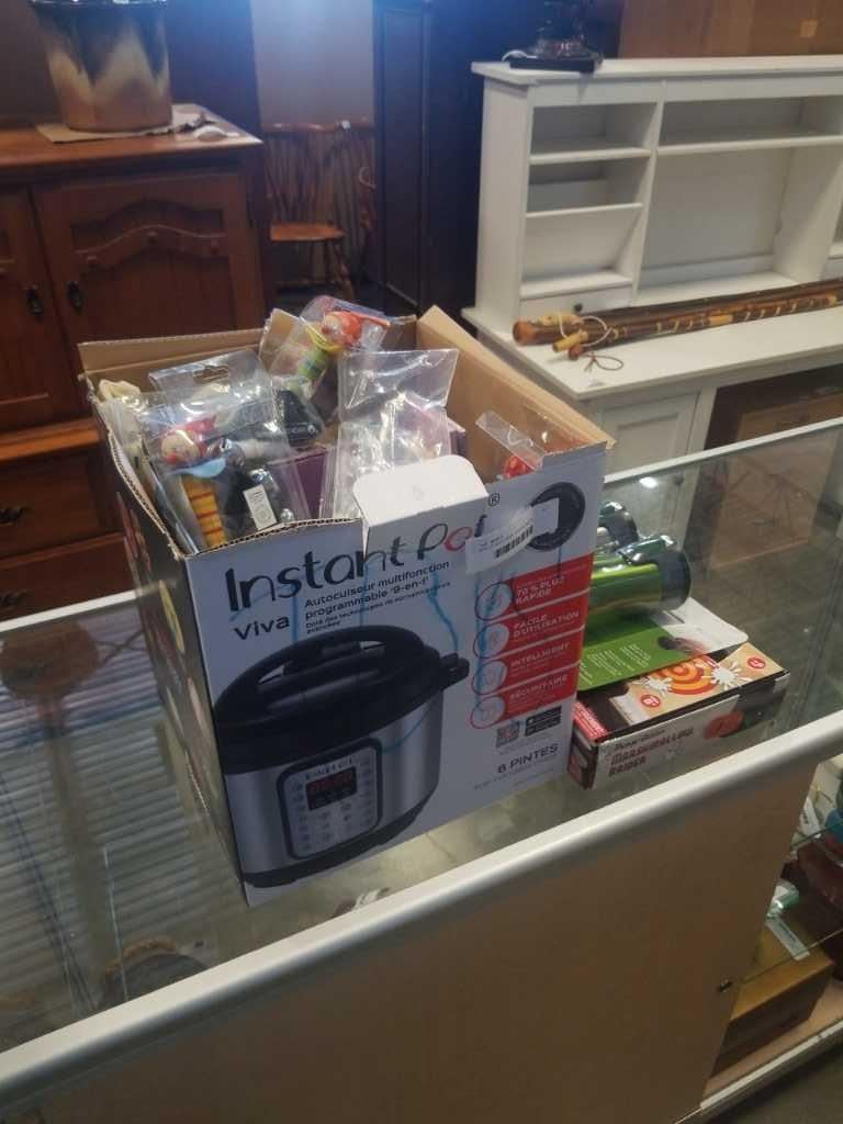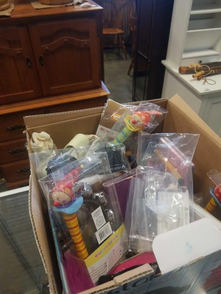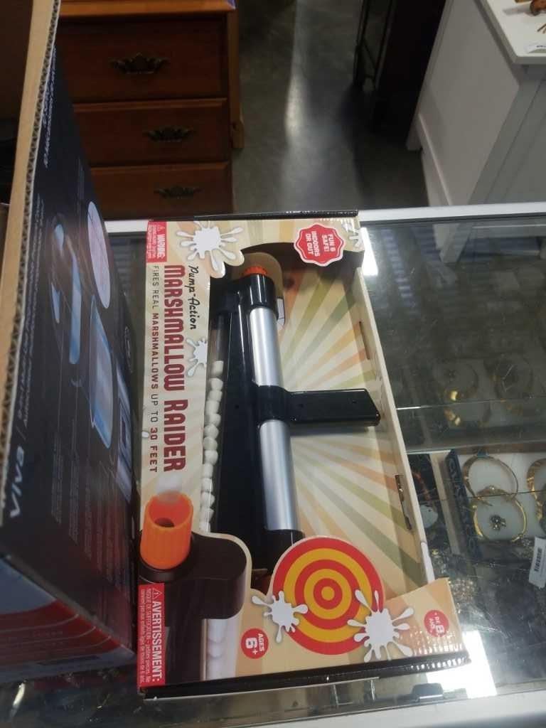 BOX OF NEW ITEMS, COFFEE MUGS, MARSHMALLOW GUN, ETC