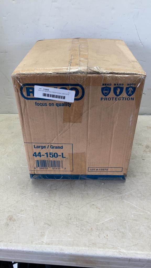BOX OF NEW POLYPROPYLENE LABCOATS SIZE LARGE