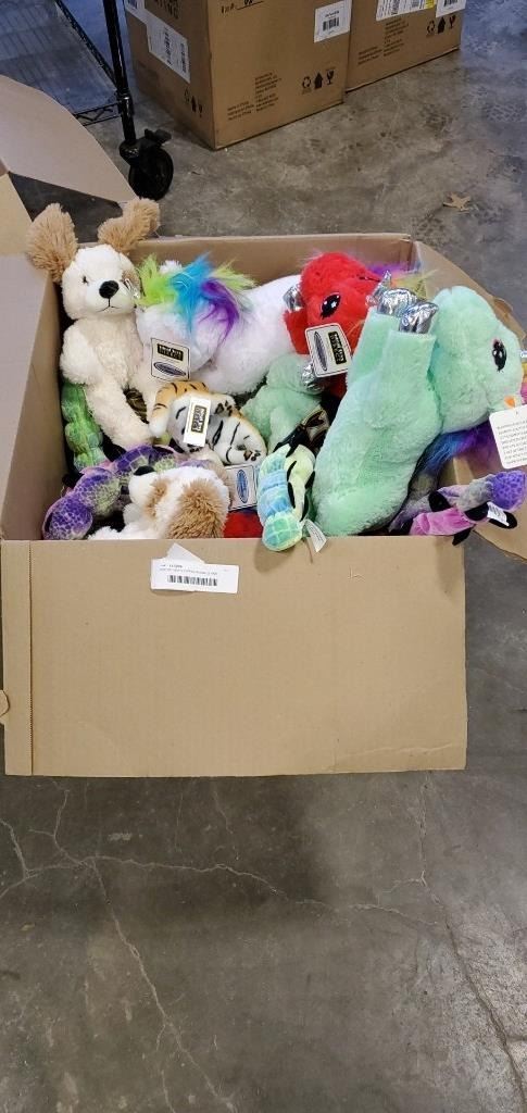 BOX OF NEW STUFFED ANIMALS AND INFLATEABLE HAMMERS