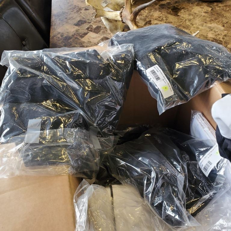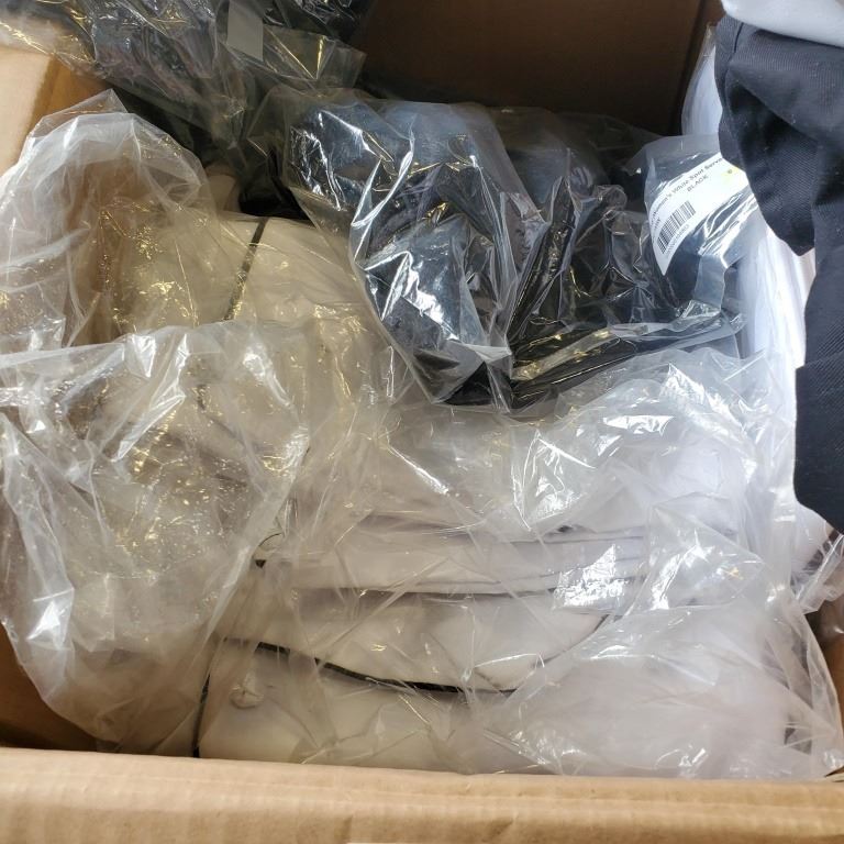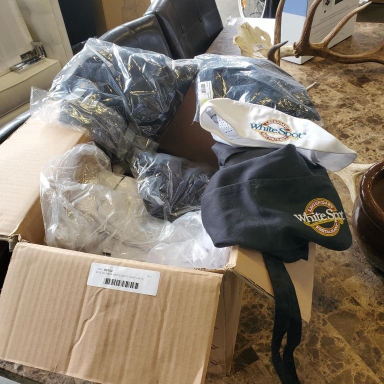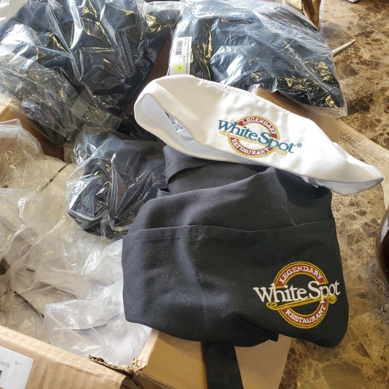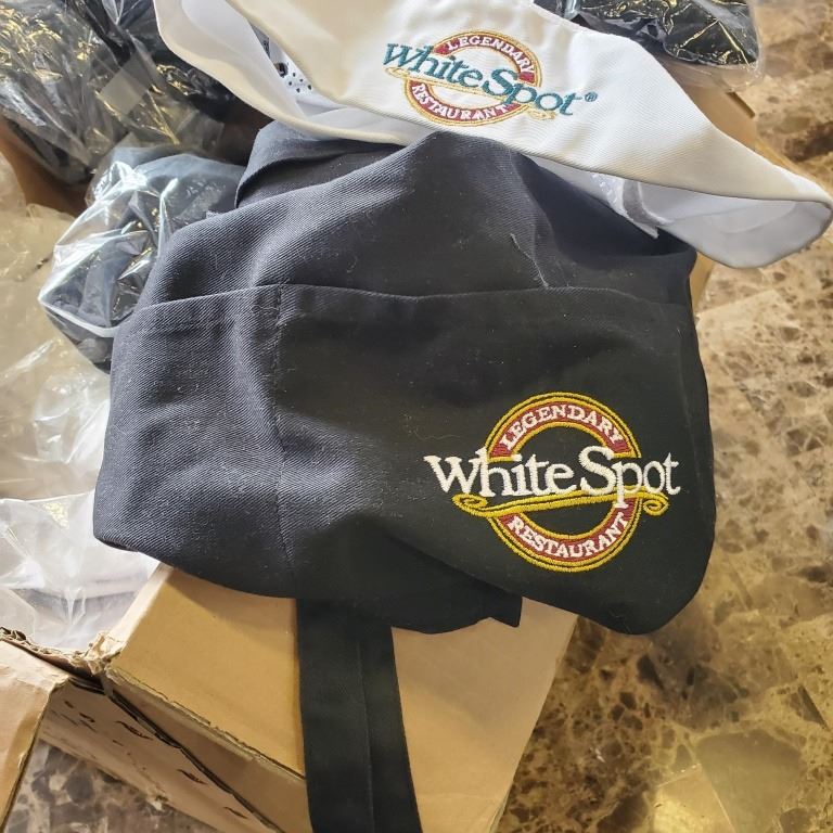 BOX OF NEW WHITE SPOT CHEF HATS, APRONS AND APPARELL