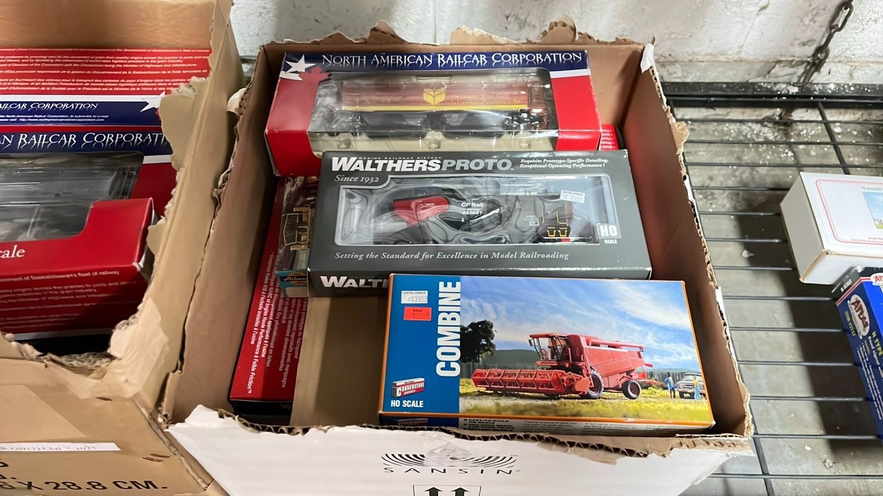 BOX OF NORTH AMERICAN RAIL CO ASSORTED HO SCALE MODEL TRAINS & MORE