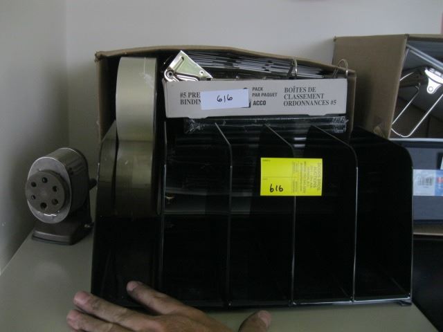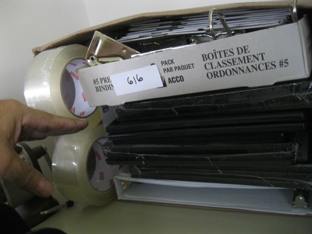 BOX OF PACKING TAPE, PICTURE FRAMES, BINDERS, ACCO BINDERS