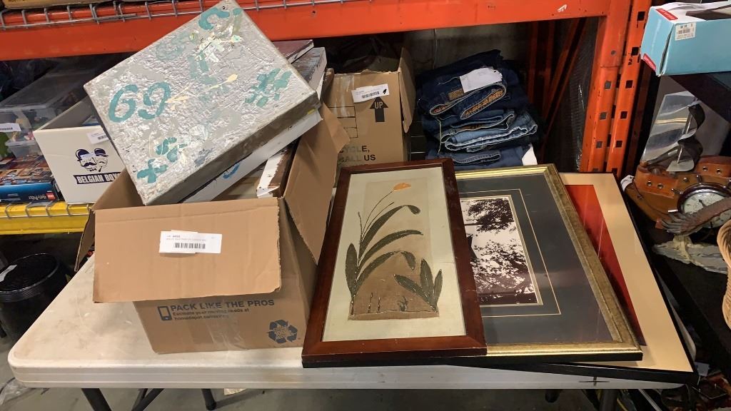 BOX OF PAINTINGS ON CANVAS AND PRINTS