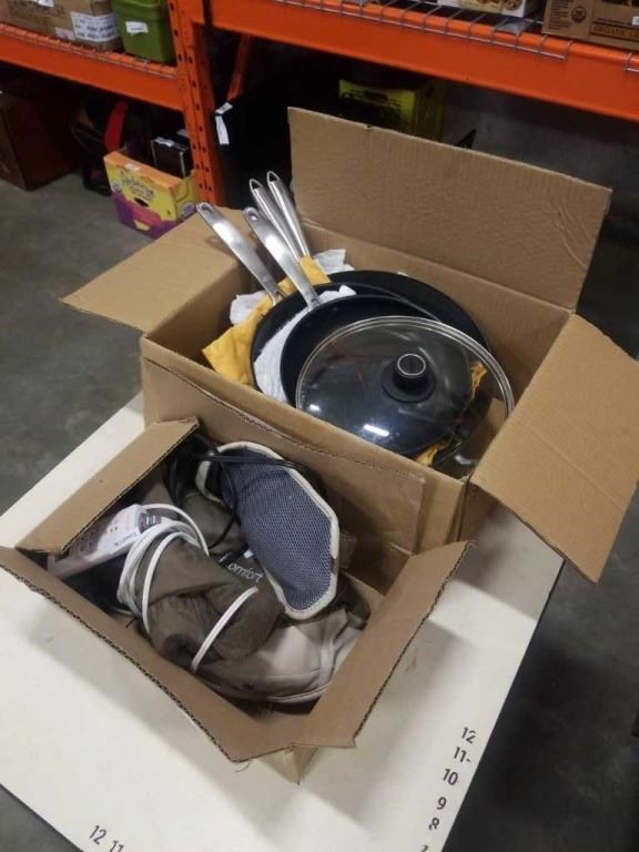 BOX OF PANS WITH HAMILTON BEACH COFFEE MAKER, NECK MASSAGER AND HEATING PAD