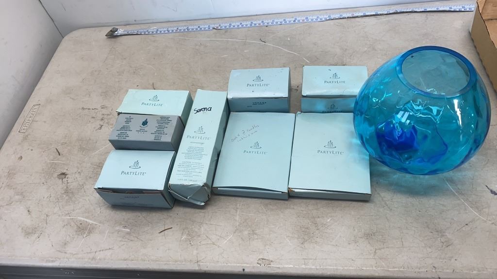 BOX OF PARTYLITE CANDLES AND GLASS CANDLE JAR