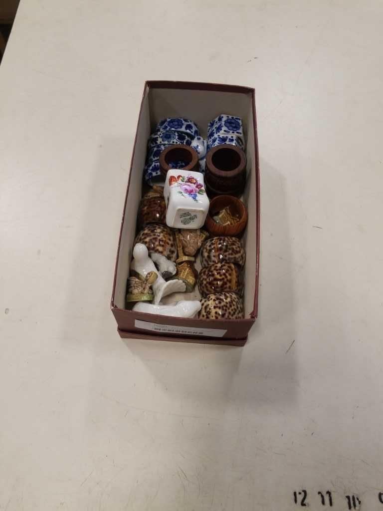 BOX OF PORCELAIN FIGURES AND NAPKIN RINGS WITH ROYAL DOULTON MUG