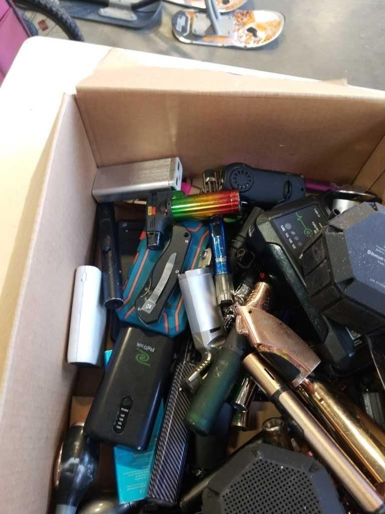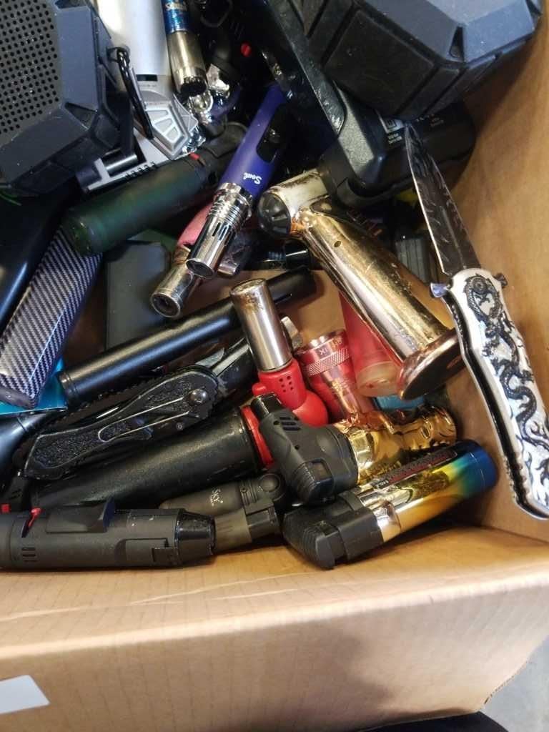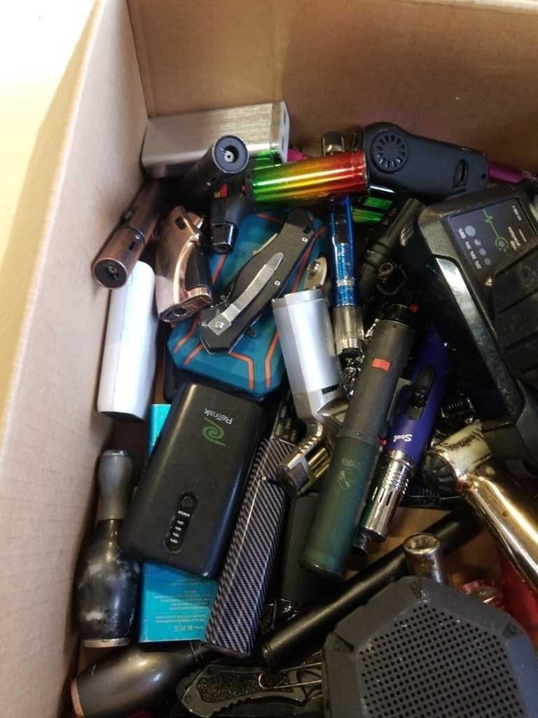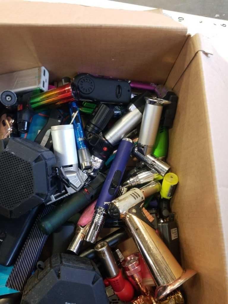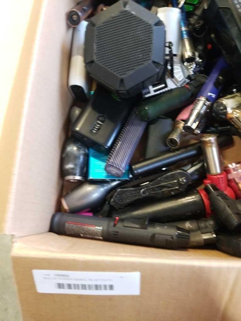 BOX OF POWER BANKS, BLUETOOTH SPEAKERS, KNIVES, AND LIGHTERS