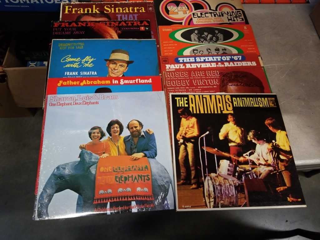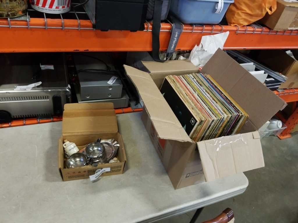BOX OF RECORDS INCLUDING ELVIS, THE MONKEES, CHICAGO AND OTHERS AND SILVER PLATE CREAM AND SUGAR AND