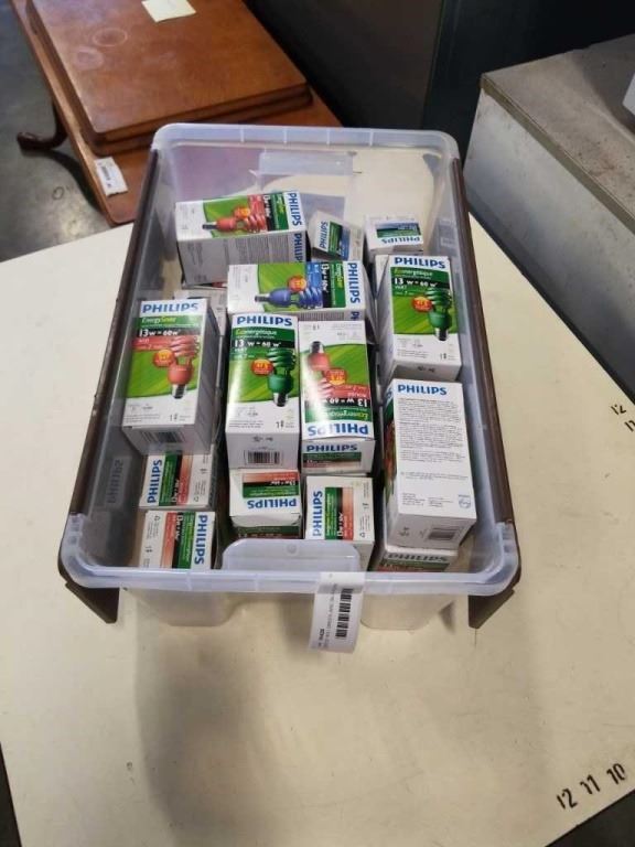 BOX OF RED GREEN AND BLUE PHILIPS LIGHTBULBS