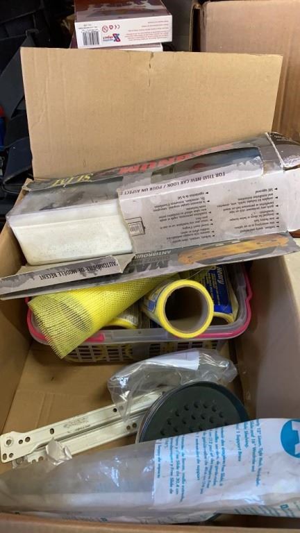 BOX OF REPAIR FABRIC, EXTENSION CORD AND MORE