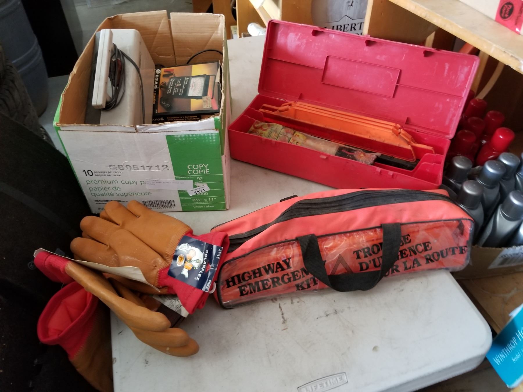 BOX OF ROAD FLARES TOOLS AND GLOVES