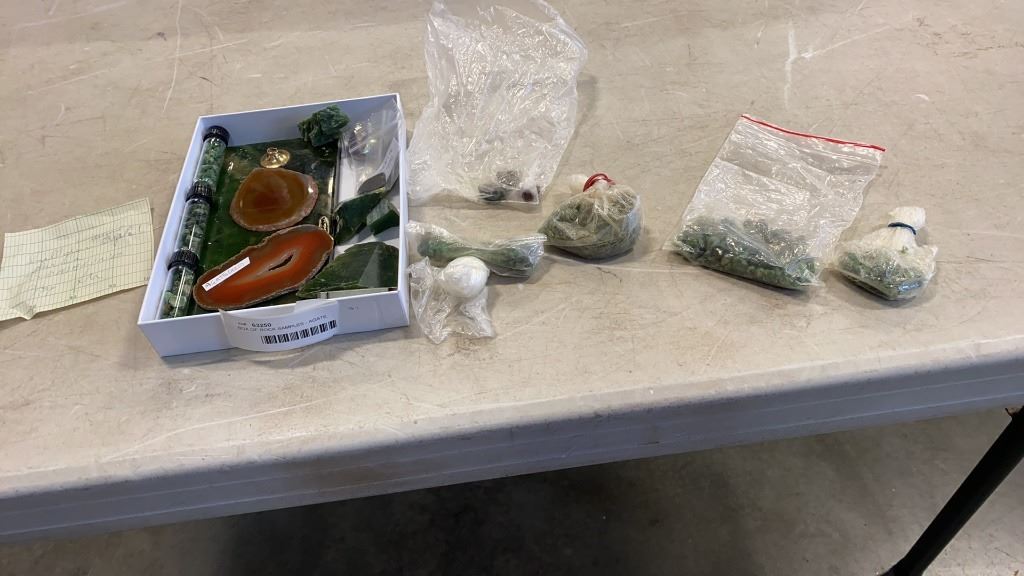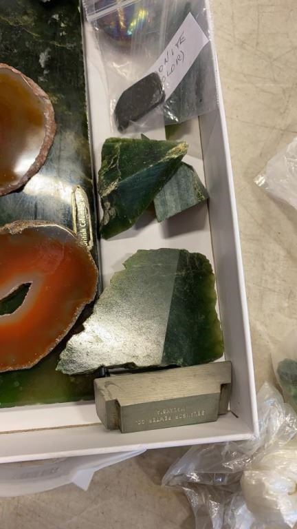 BOX OF ROCK SAMPLES - AGATE, AMMONITE, JADE, TOURMALINE AND OTHERS