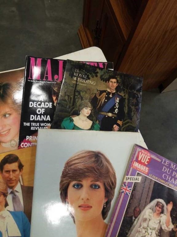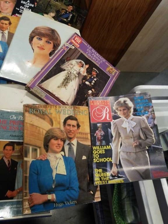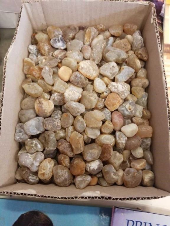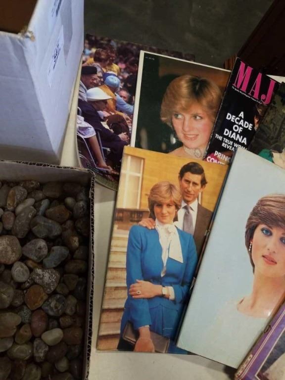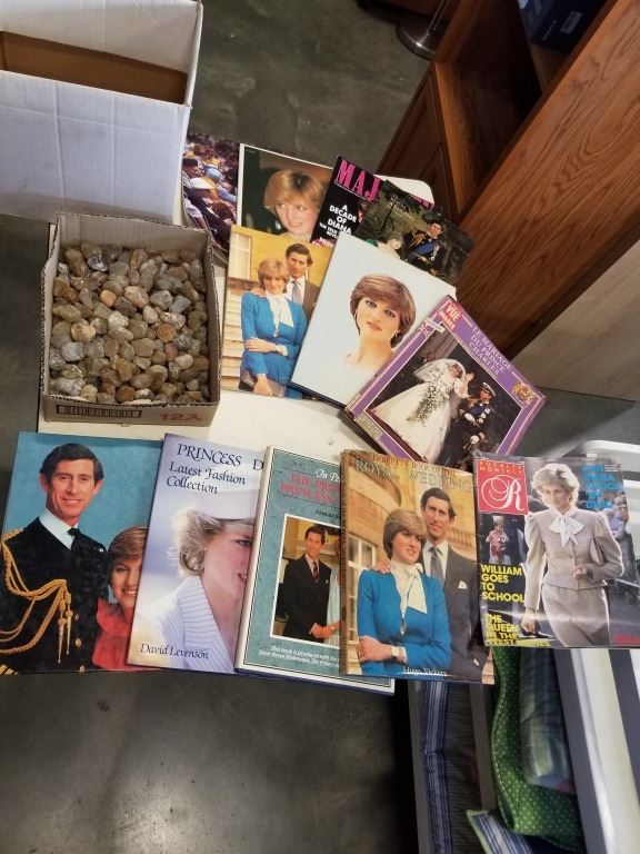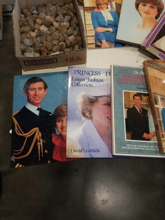 BOX OF ROYALTY BOOKS AND TRAY OF SEMI PRECIOUS STONES