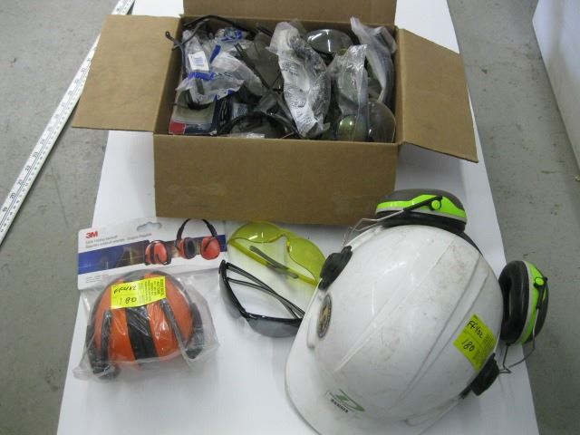 BOX OF SAFETY GLASSES, HARDHAT, EARMUFFS