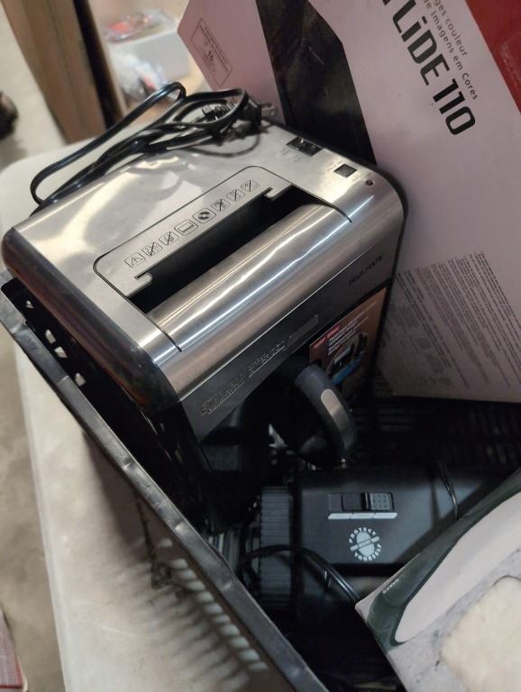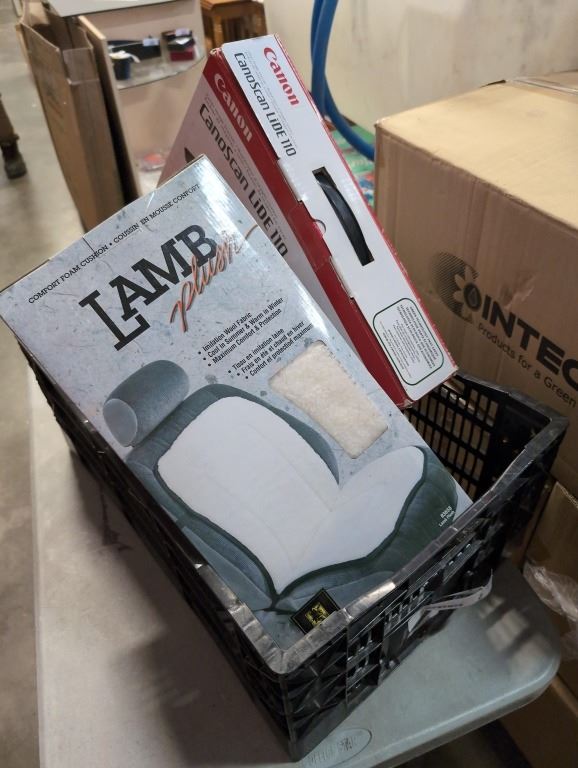 BOX OF SCANNER, SEAT COVERS AND PAPER SHREDDER