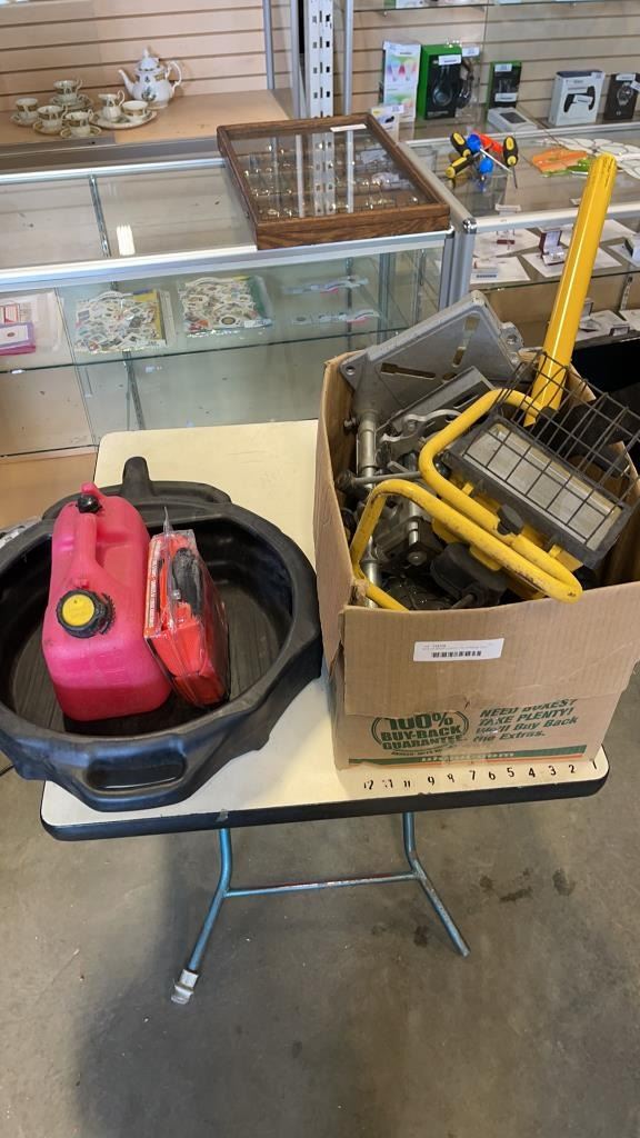 BOX OF SHOP LIGHTS, OIL CHANGE TRAY, JERRY CAN AND AUTOMOTIVE FUILDS