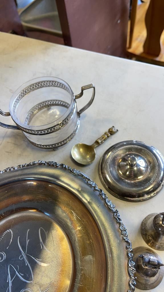 BOX OF SILVER PLATE AND PIER ONE ORNAMENTAL TREE