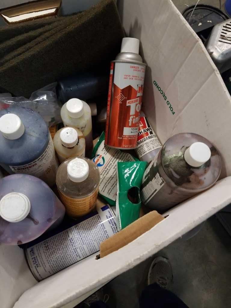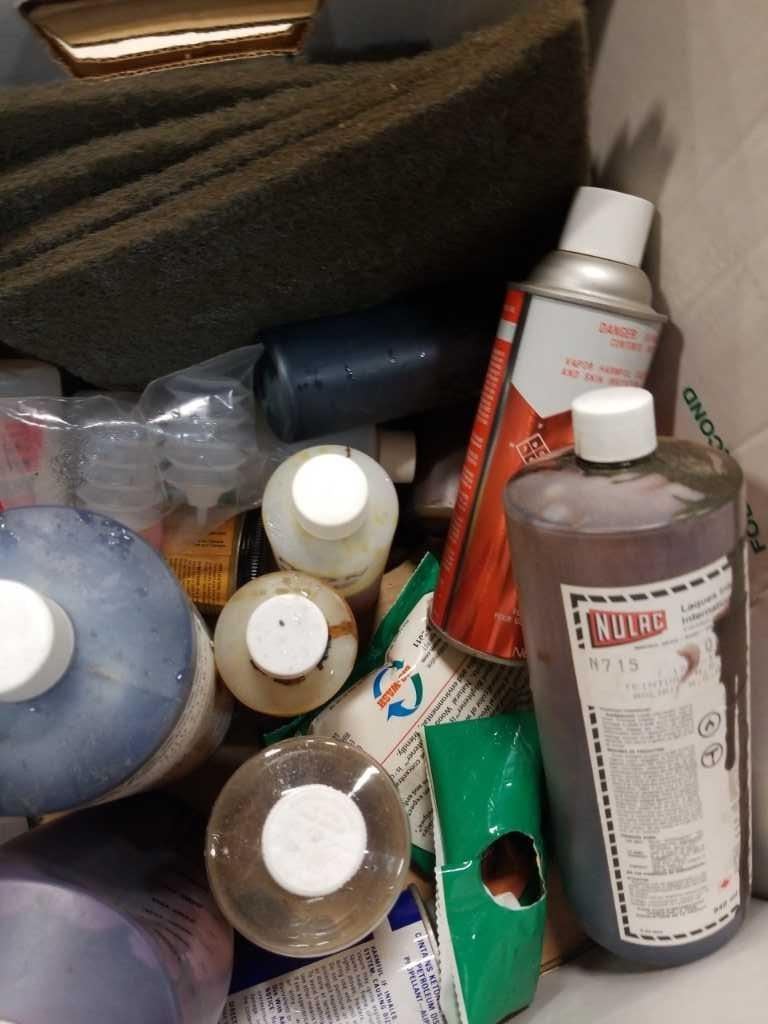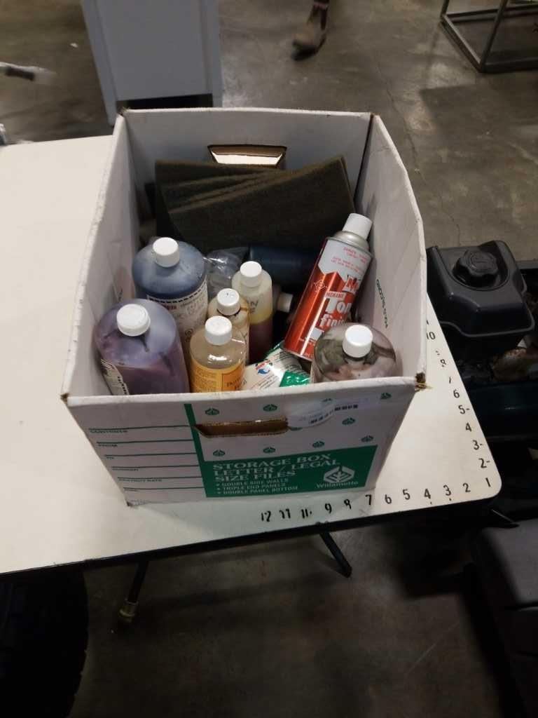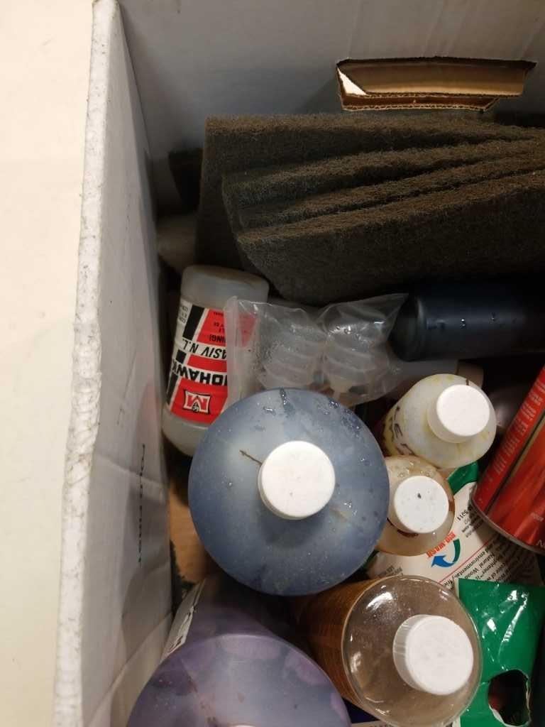 BOX OF STAIN AND FINISH FLUIDS AND ABRASIVE PADS