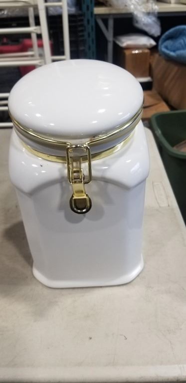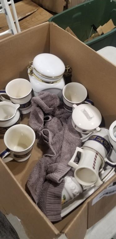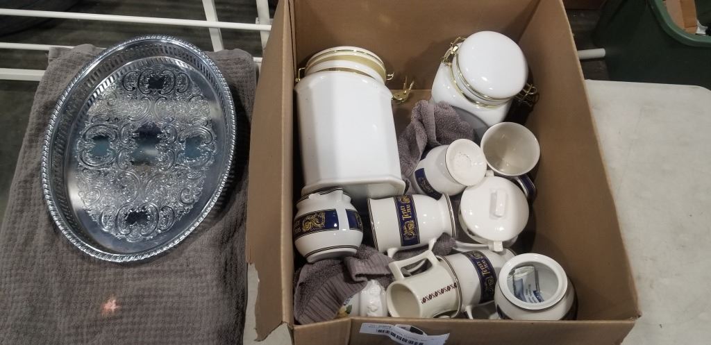 BOX OF TETLEY CHINA, PLATTER, AND CANNISTERS
