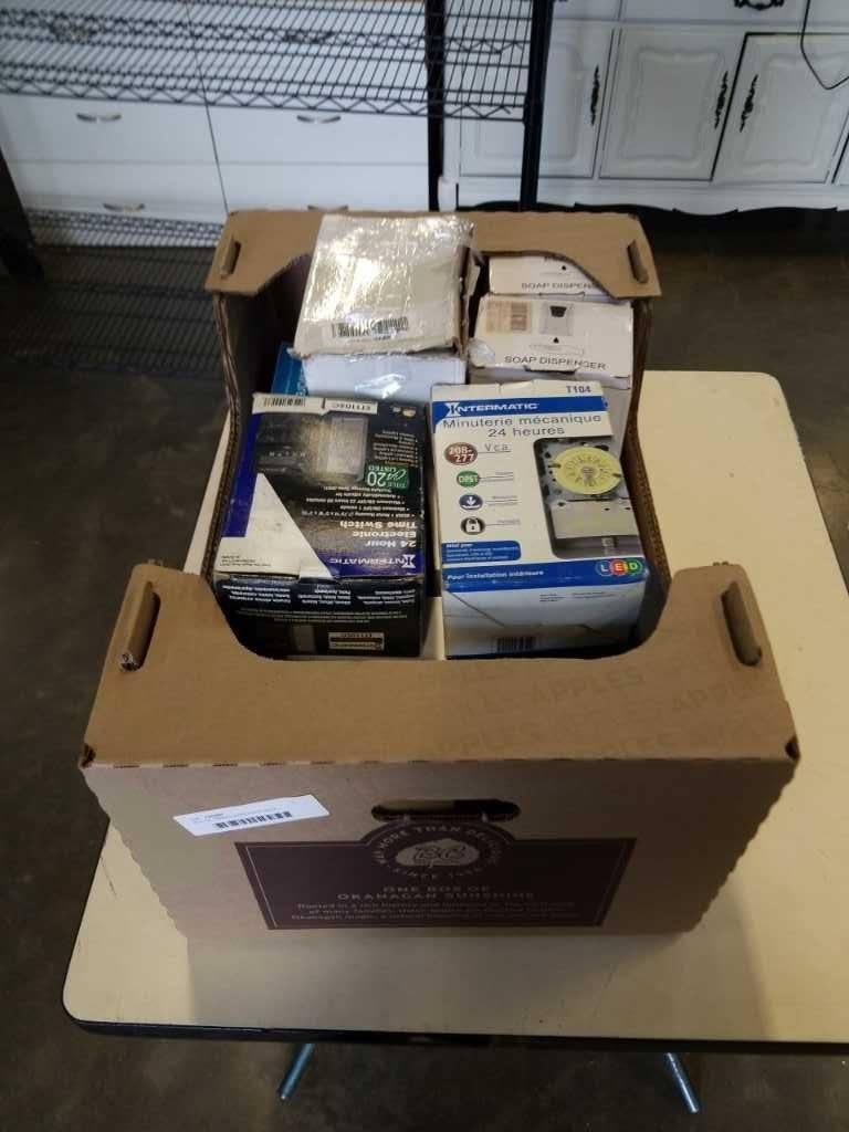 BOX OF TIMERS, BAKEWARE RACK, DISPENSERS AND MORE