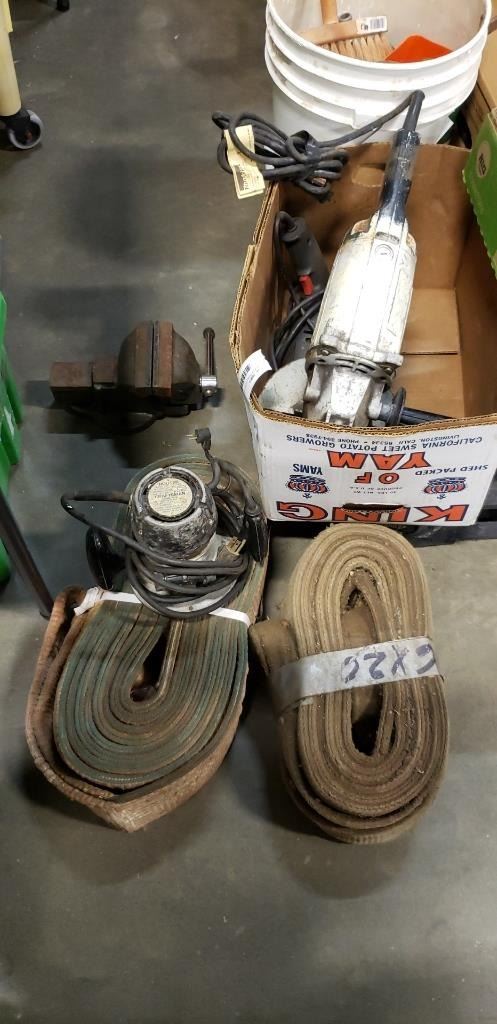 BOX OF TOOLS, BENCH VICE, ROUTER, ANGLE GRINDER, LOAD STRAP