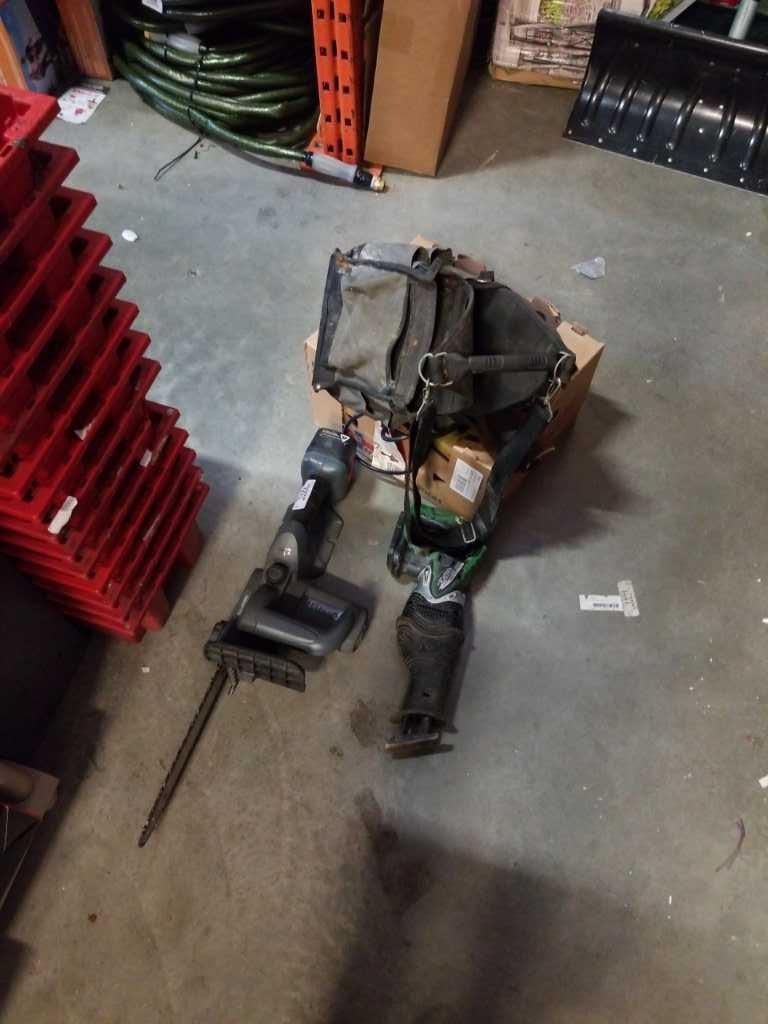 BOX OF TOOLS, CORDLESS HITACHI TOOLS - NO BATTERIES AND TOOL BAG