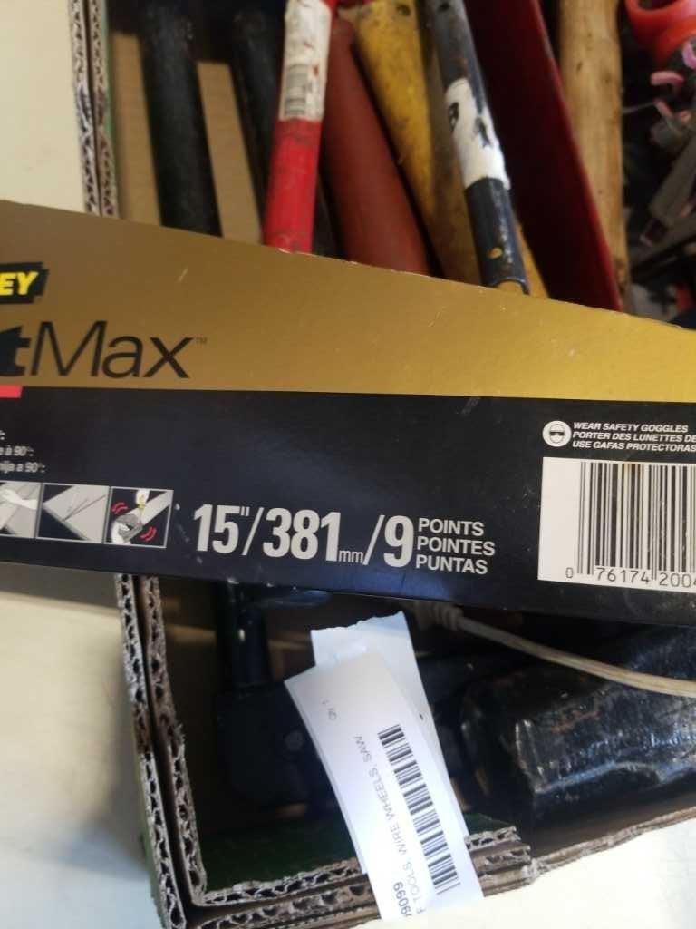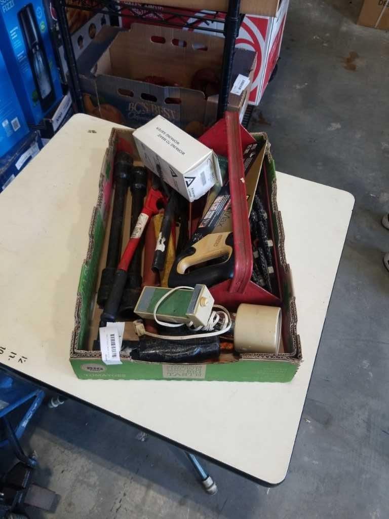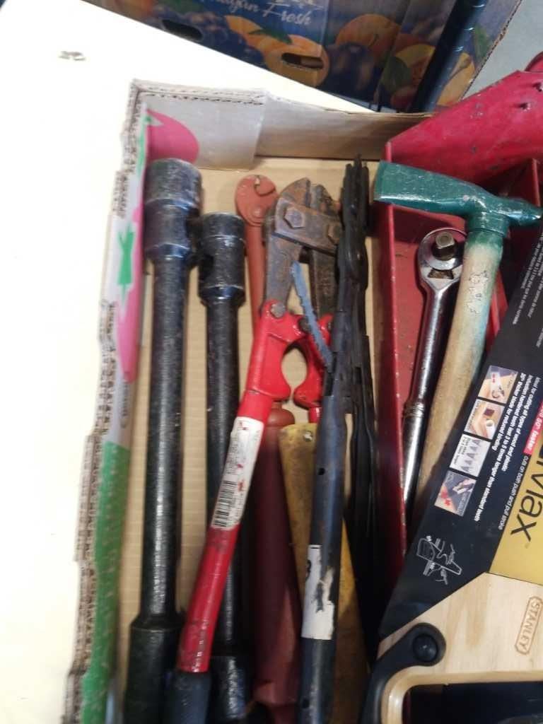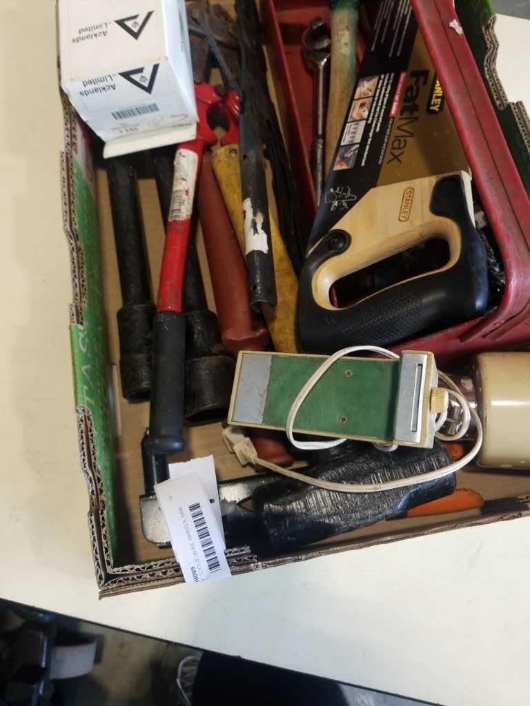 BOX OF TOOLS, WIRE WHEELS, SAW
