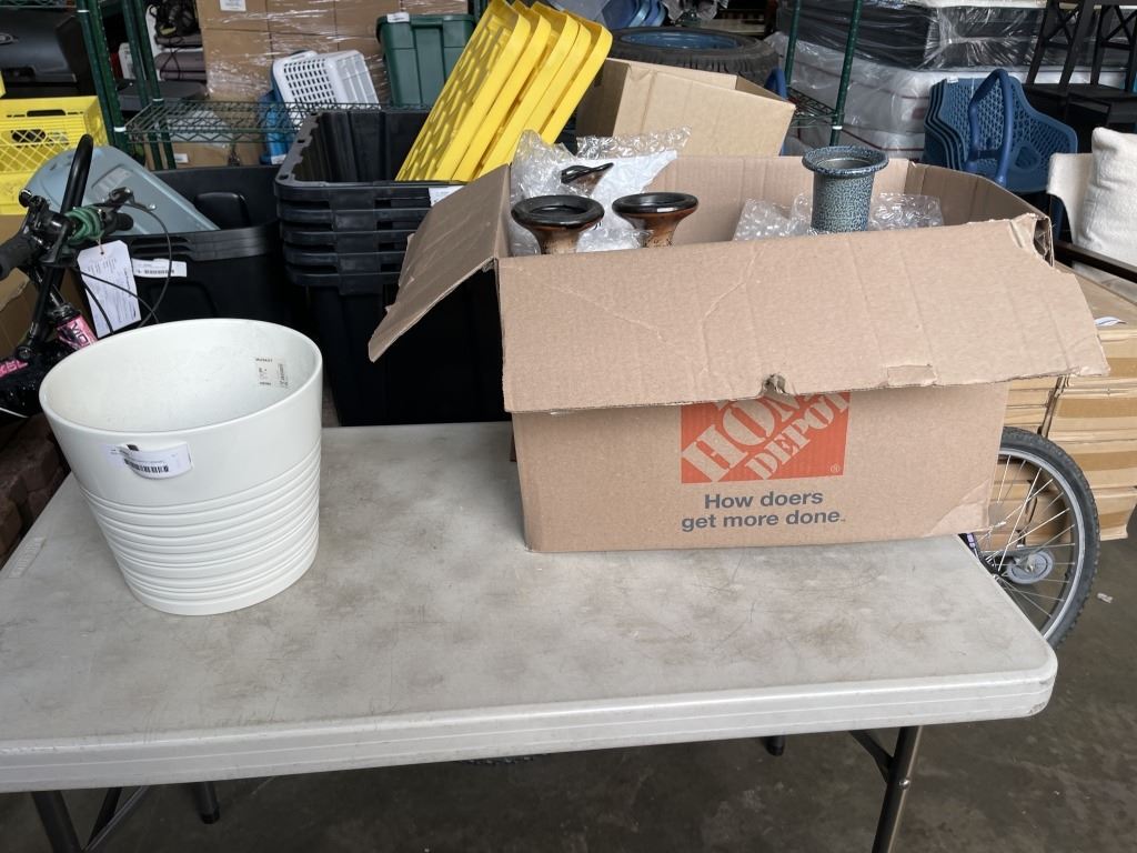 BOX OF VASES AND WHITE CERAMIC GARBAGE BIN