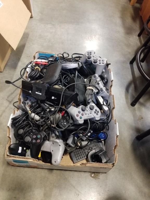 BOX OF VIDEOGAME CONTROLLERS AND ACCESSORIES - SUPERNINTEDO, ETC