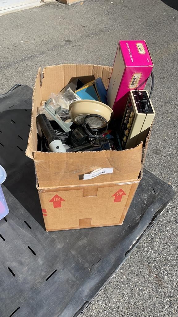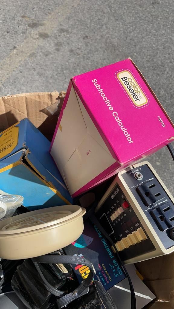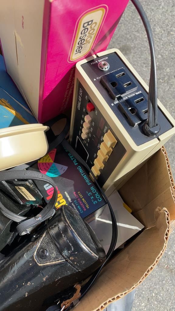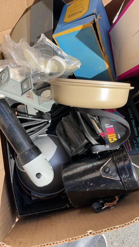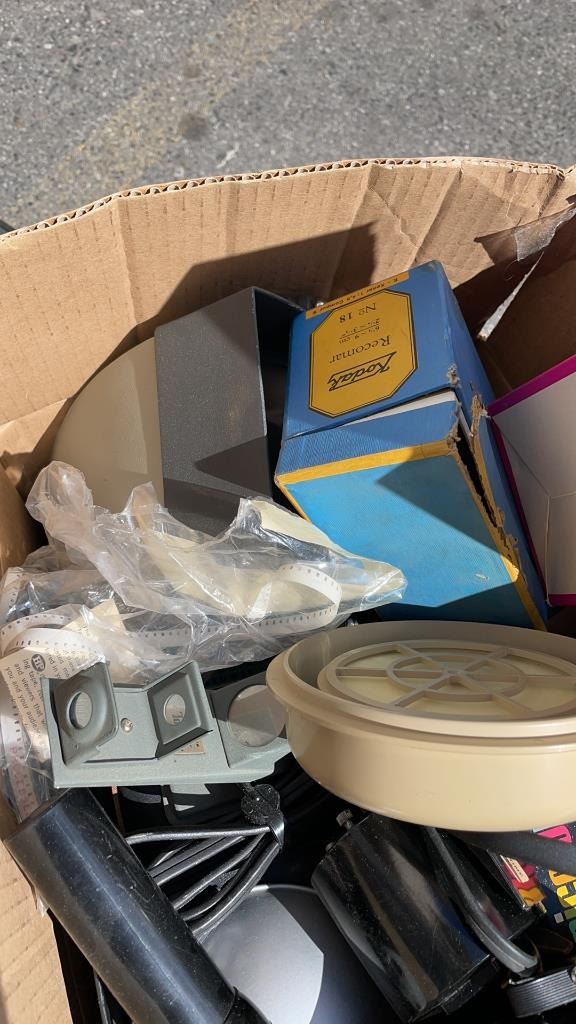 BOX OF VINTAGE CAMERA AND FILMING ACCESSORIES INCLUDING CANON LENS
