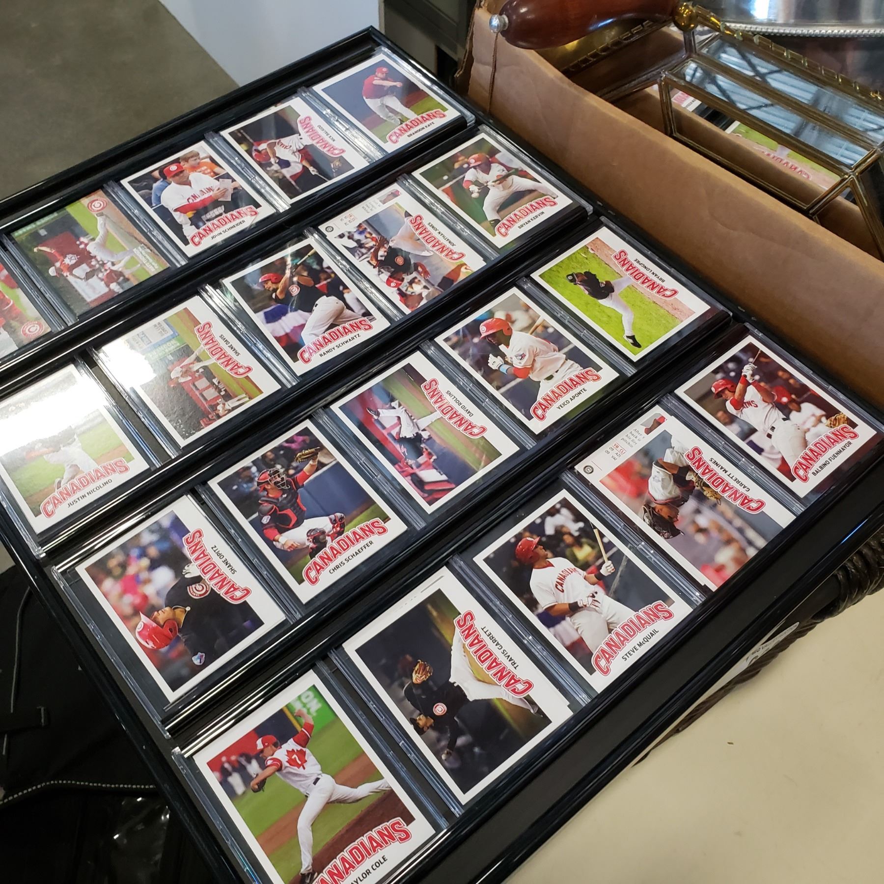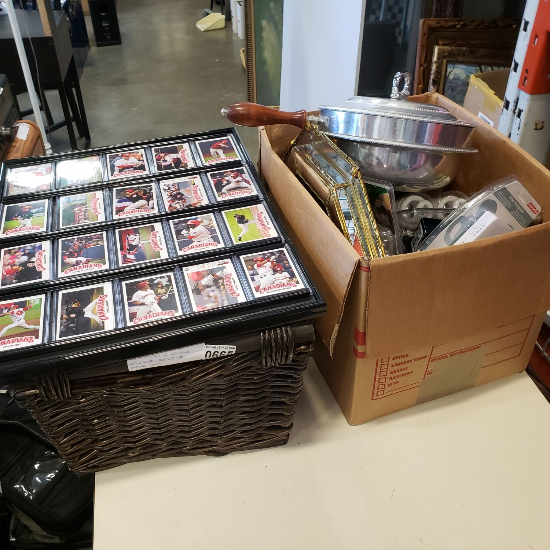 BOX OF VINTAGE COLLECTIBLES AND 2 WICKER BASKETS AND BASEBALL CARDS
