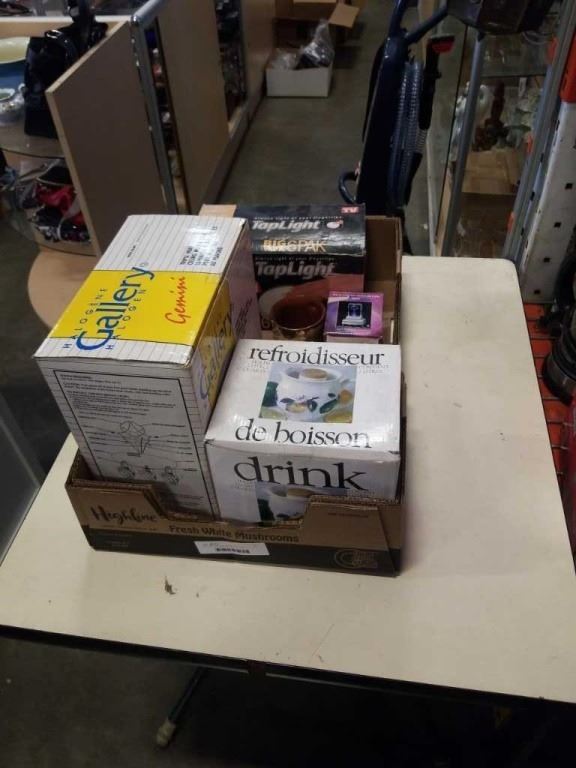 BOX OF VINTAGE DRINK CHILLER, TOPLIGHT SET AND MORE