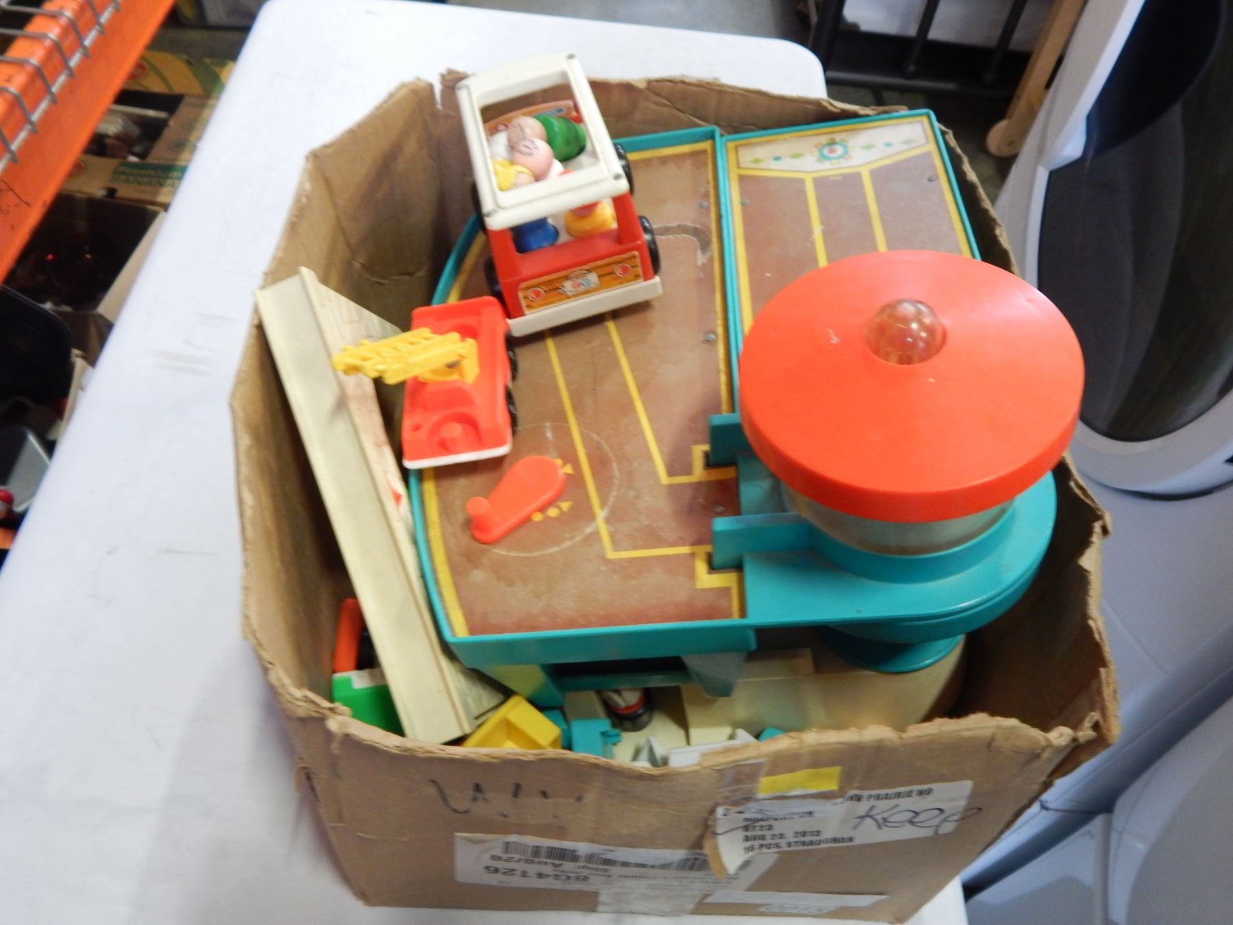 BOX OF VINTAGE FISHER PRICE TOYS, FIGURES, CARS, AND GAS STATION