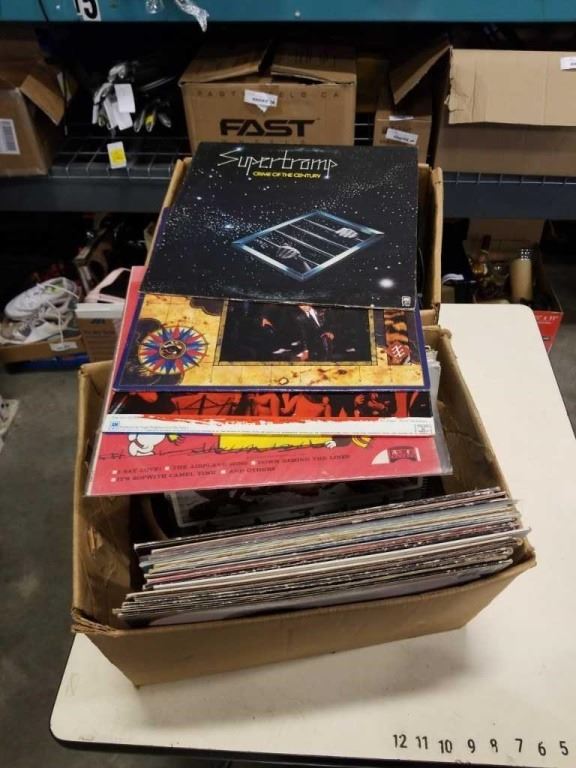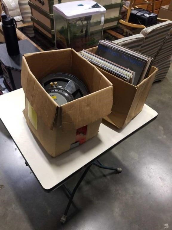 BOX OF VINTAGE ROCK RECORDS AND 2 PRERCISION LOUDSPEAKERS EL-300 SUBWOOFERS